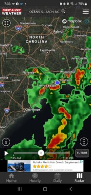 As seems to be the norm winds are being pushed with this storm. At the OIB pier (see pics) winds are 16 to 20 mph and that’s already our threshold for removing umbrellas as we have insurance guidelines to abide by. However, outside of the winds, the Future Radar (mostly accuracte) shows around 10:30 a developing storm over us. Even if we set up umbrellas and they’re closed, they can still get wind under them and blow away or literally get knocked over from being wind buffeted.