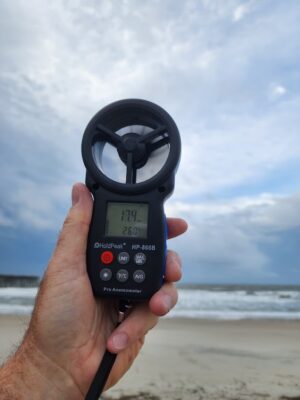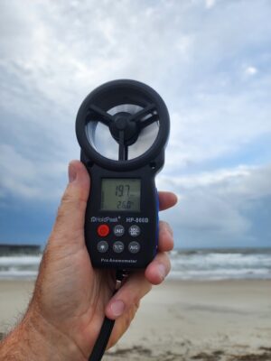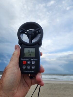 As seems to be the norm winds are being pushed with this storm. At the OIB pier (see pics) winds are 16 to 20 mph and that’s already our threshold for removing umbrellas as we have insurance guidelines to abide by. However, outside of the winds, the Future Radar (mostly accuracte) shows around 10:30 a developing storm over us. Even if we set up umbrellas and they’re closed, they can still get wind under them and blow away or literally get knocked over from being wind buffeted.