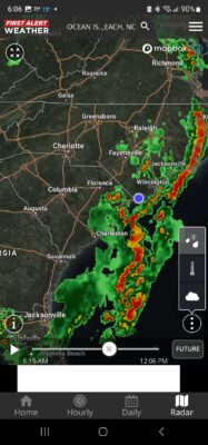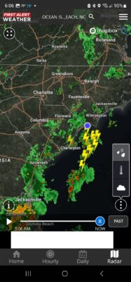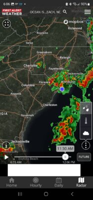 As of 6 a.m. there is significant storm related activity coming up the coastline from Florida. The current storm at present should be gone by 8 a.m. and then there will be a ‘break’ according to future radar and at that time we will review what radar looks like and then make the decision to setup or not setup. Future radar as of 6:15 a.m. is showing all this activity still with us until the noon hour. We need you to understand, and we explain this is our policies online, that it takes us approximately 2 hours to get everyone set up and we are not going to put kids out on the beach with any lightening activity for the sake of an umbrella. Sometimes the beach is what it is, the beach and with the beach comes all sorts of weather. Last week it was winds and I mean craxy amounts of winds, 25 mph winds with gusts to 30 and it was a nightmare for everyone involved, not just companies but for everyone on the beach. Sometimes it’s not the perfect day for beach activity. That being said, we have a limitation on when we can set up as we aren’t going to set up past noon, as half the day is gone.